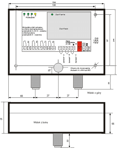 Układ należy zamocować mechanicznie do podstawy trzema wkrętami M4 przez otwory w dolnej części obudowy ( wymiary na rysunku gabarytowym). W zależności od typu zastosowanych czujników ustawić odpowiednio zwory na płytce drukowanej zgodnie z opisem podanym niżej. Podłączyć ochronę, zasilanie i czujniki. Styki przełączne połączyć według potrzeb. Układ nie wymaga regulacji. Położenie pracy dowolne. Zaciski przyłączeniowe o średnicy max. 2,5mm2