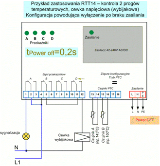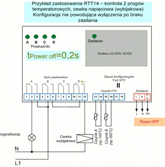 Układ RTT14 przeznaczony jest do nadzorowania temperatury transformatorów suchych i żywicznych oraz silników wyposażonych w czujniki typu PTC lub NTC. Układ kontroluje maksymalnie trzy progi temperatur. Wyjściem układu dla każdego z czujników temperatury jest przekaźnik ze stykiem przełącznym.Czwarty przekaźnik pracuje jako układ czasowy załączający sie ze zwłoką 5 sekund od podania zasilania na układ RTT.